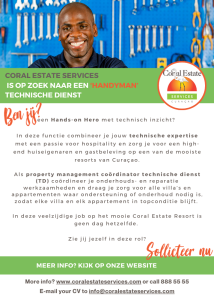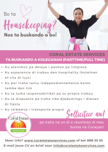 Na Coral Estate Services, nos ta kere ku e aktitut korekto ta mas importante ku eksperensia. Nos ta balorá kolaborashon, orientashon na huespednan, solushon di problema i entusiasmo. Tur hende por siña skillnan – pero pasi, dedikashon i un aktitut positibo ta e diferencia!